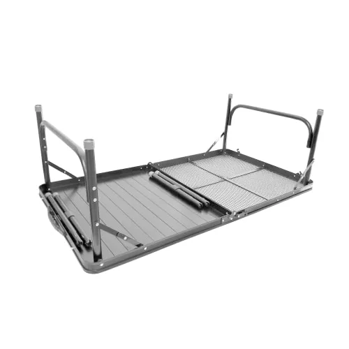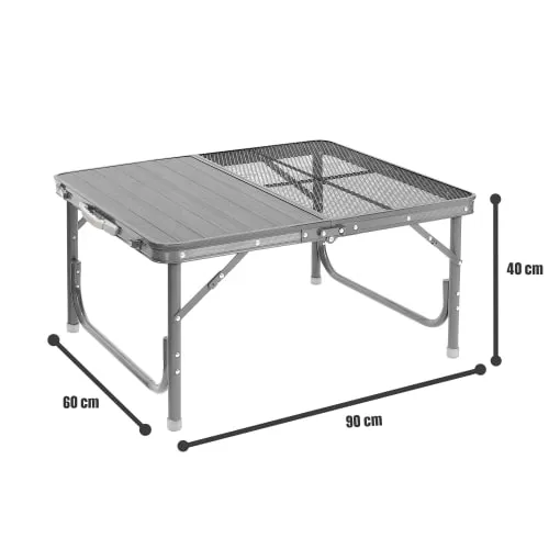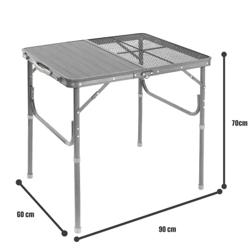 طاولة الألمنيوم 90× 60 سم بسطح مزدوج تعتبر خيار عملي لمحبي الرحلات والتخييم. تصميم السطح نص ألمنيوم ونص شبك يمنحك مرونة أكبر في الاستخدام، حيث يوفر جزء الألمنيوم سطحًا ثابتًا للأدوات، بينما يساعد جزء الشبك على التهوية وتقليل تجمع الحرارة.