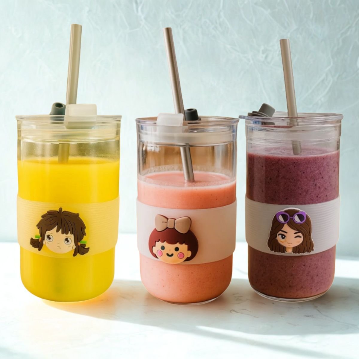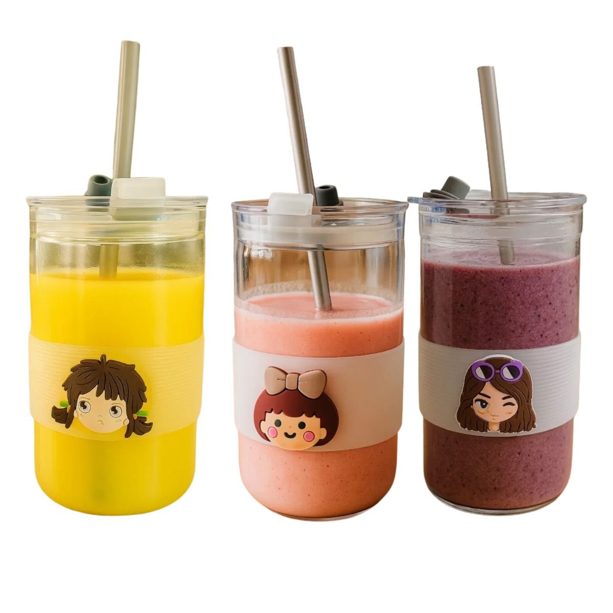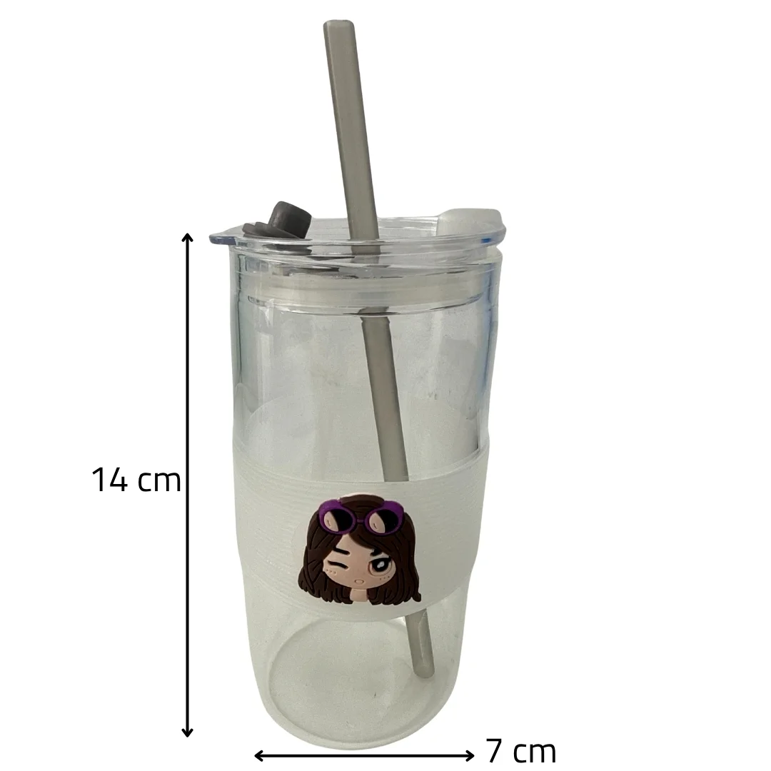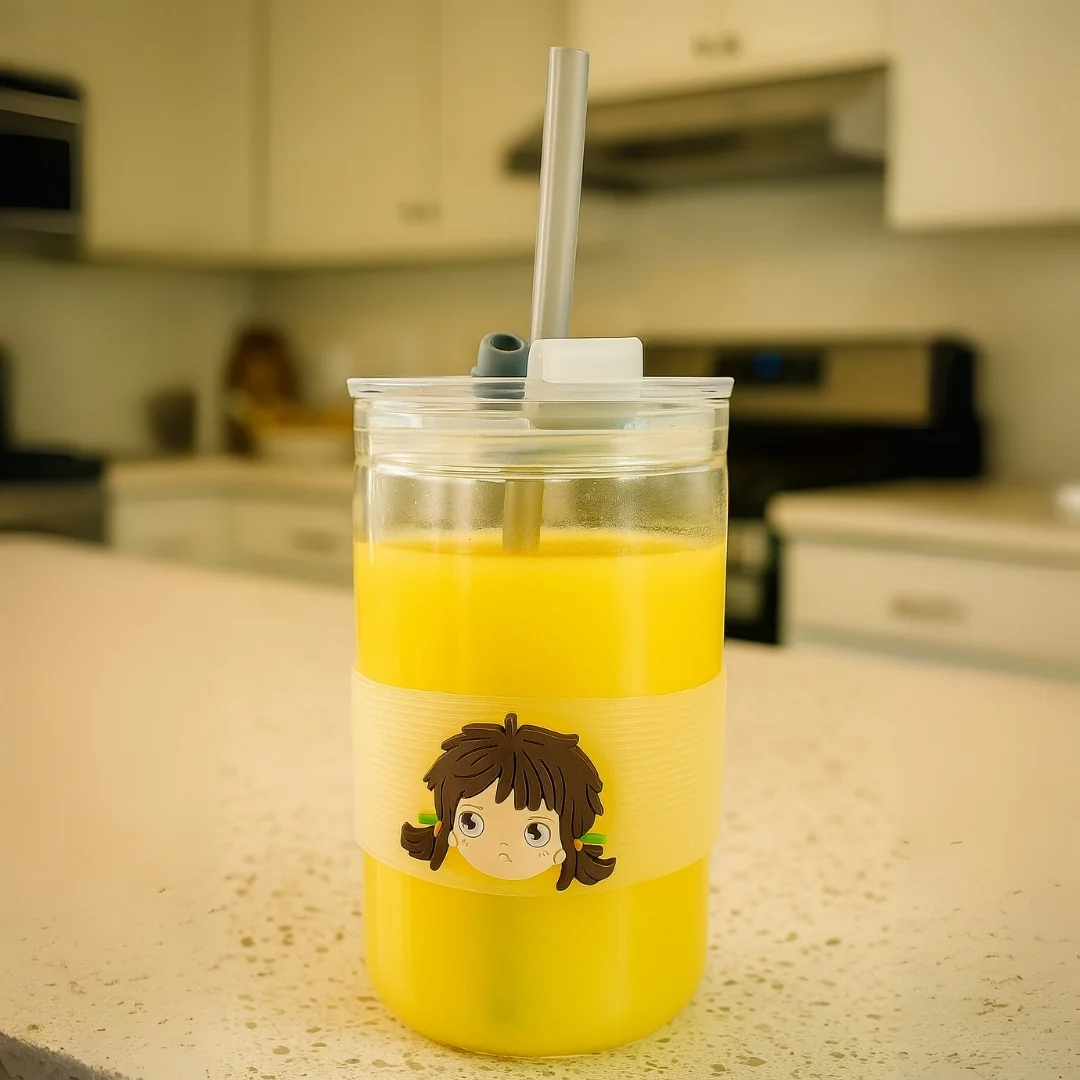 كوب زجاجي أنيق مزود بمصاصة بلاستيكية وغطاء محكم، مع حلقة سيليكون مانعة للانزلاق برسومات كرتونية لطيفة. مناسب للمشروبات الباردة والساخنة (باستخدام الغطاء فقط). مثالي للأطفال ومحبي التصاميم الكرتونية.