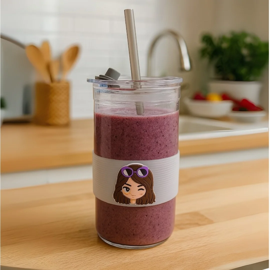 يأتي الكوب بتصميم شفاف من الزجاج مع غطاء محكم لمنع التسرب، ومصاصة بلاستيكية قوية تُثبّت بفتحة سيليكون خاصة تسهّل الشرب دون إزالة الغطاء.