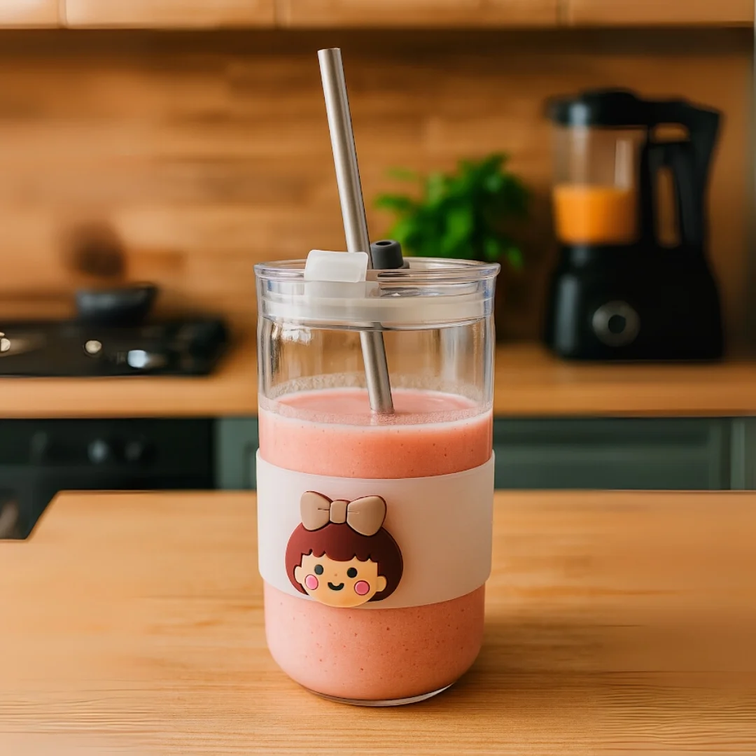 كوب زجاجي مع مصاصة – تصميم كرتوني لطيف | شفاف، آمن، ممتع