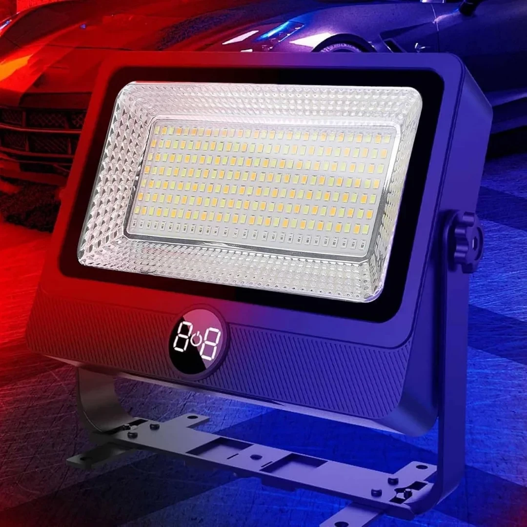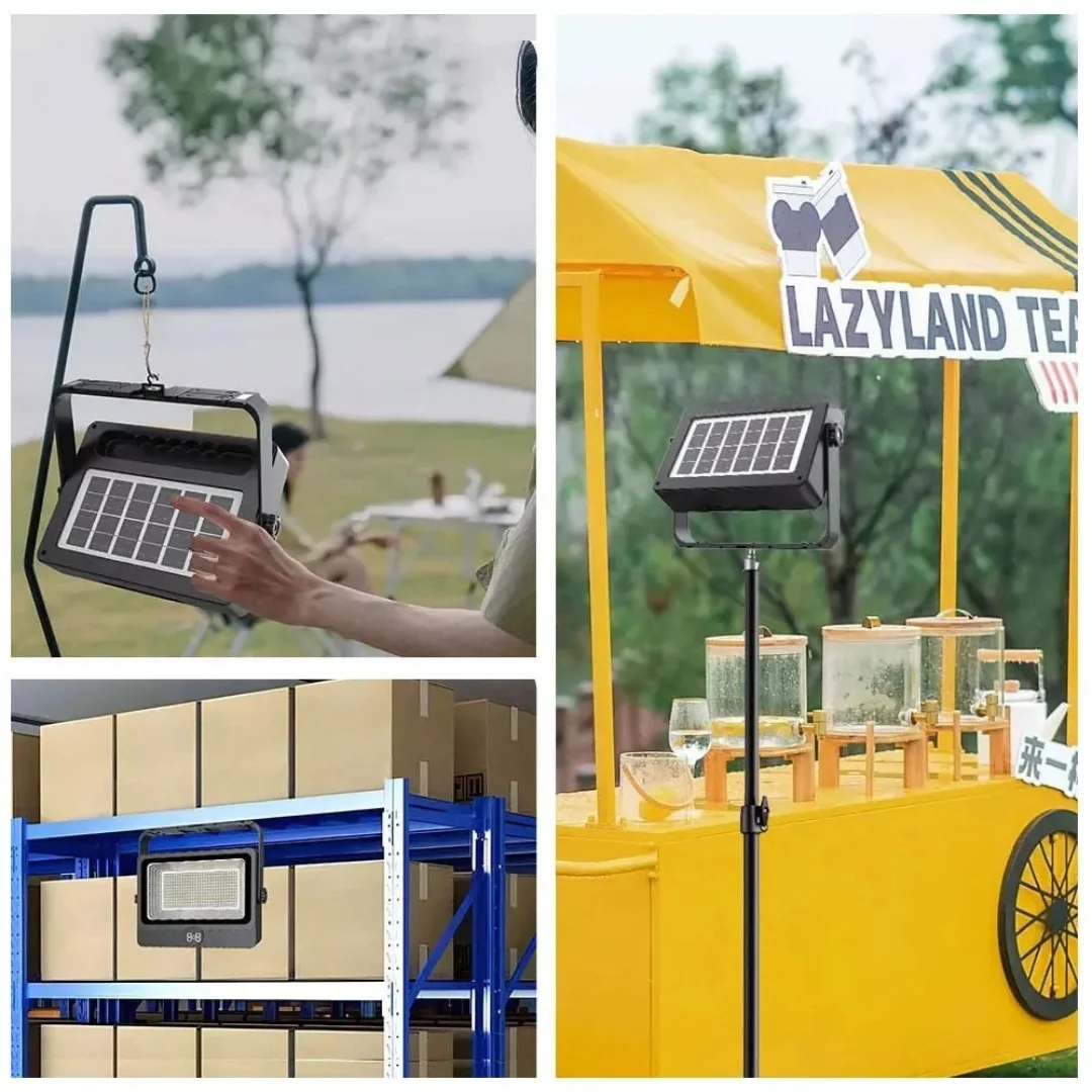 مصباح كشاف قوي يعمل بالطاقة الشمسية، مزوّد بـ 232 حبة LED عالية السطوع بعدة ألوان للإضاءة والعمل والطوارئ. بطارية تدوم حتى 8 ساعات، شحن Type-C، منفذي USB لشحن الهاتف، وتثبيت مرن عبر الخطاف أو المغناطيس أو الحامل الثلاثي القابل للتعديل حتى 193 سم.