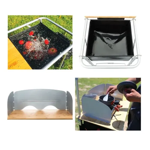 تم تصميم المطبخ ليكون سهل الفك والتركيب، مع تزويده بـ غطاء غلاف الرياح لحماية اللهب أثناء الطهي، إضافة إلى حامل قمامة يساعدك على الحفاظ على النظافة في موقع الرحلة. كما يأتي مع شنطة خاصة للحفظ لتسهيل النقل والتخزين.